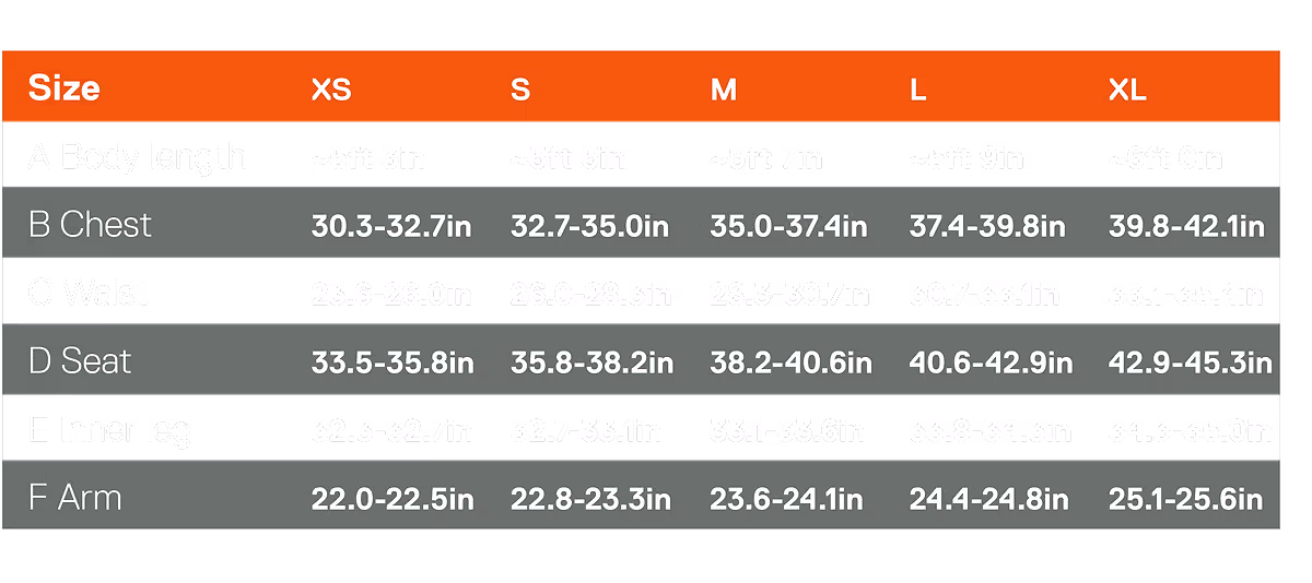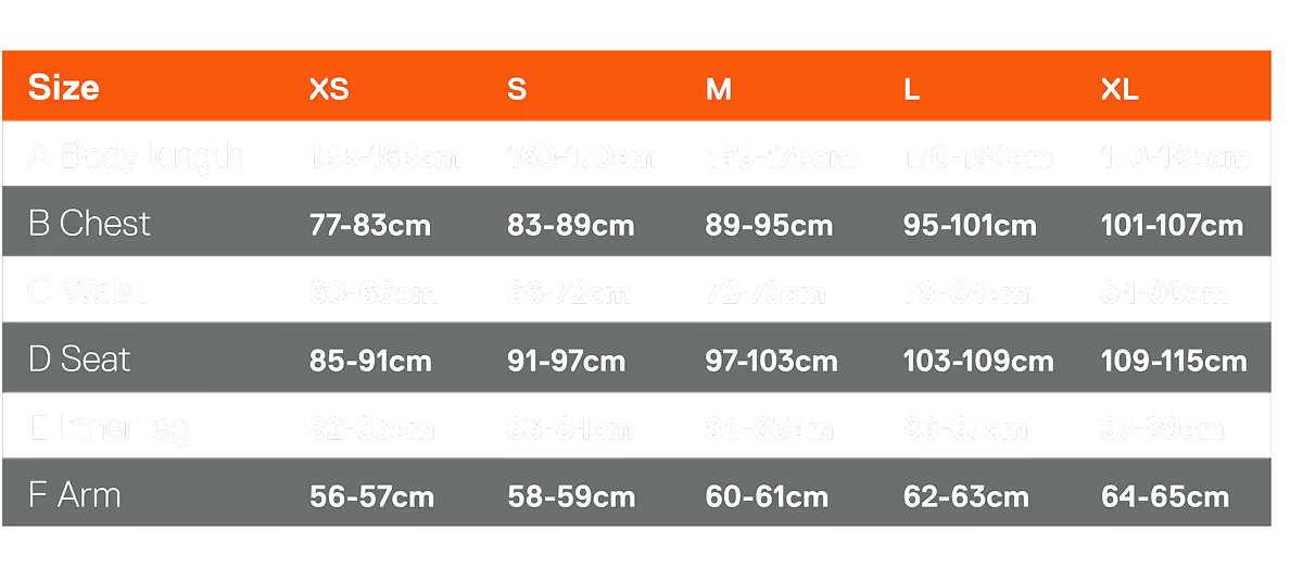 Take your body measurements and compare them to the chart below. The numbers in our size guide represent recommended body measurements, not the exact dimensions of our gear. If you’re between sizes, we recommend sizing up unless you prefer a more streamlined fit for your activity — or a tighter look for the après. Need advice? Our customer service team is here to help — don’t hesitate to reach out!