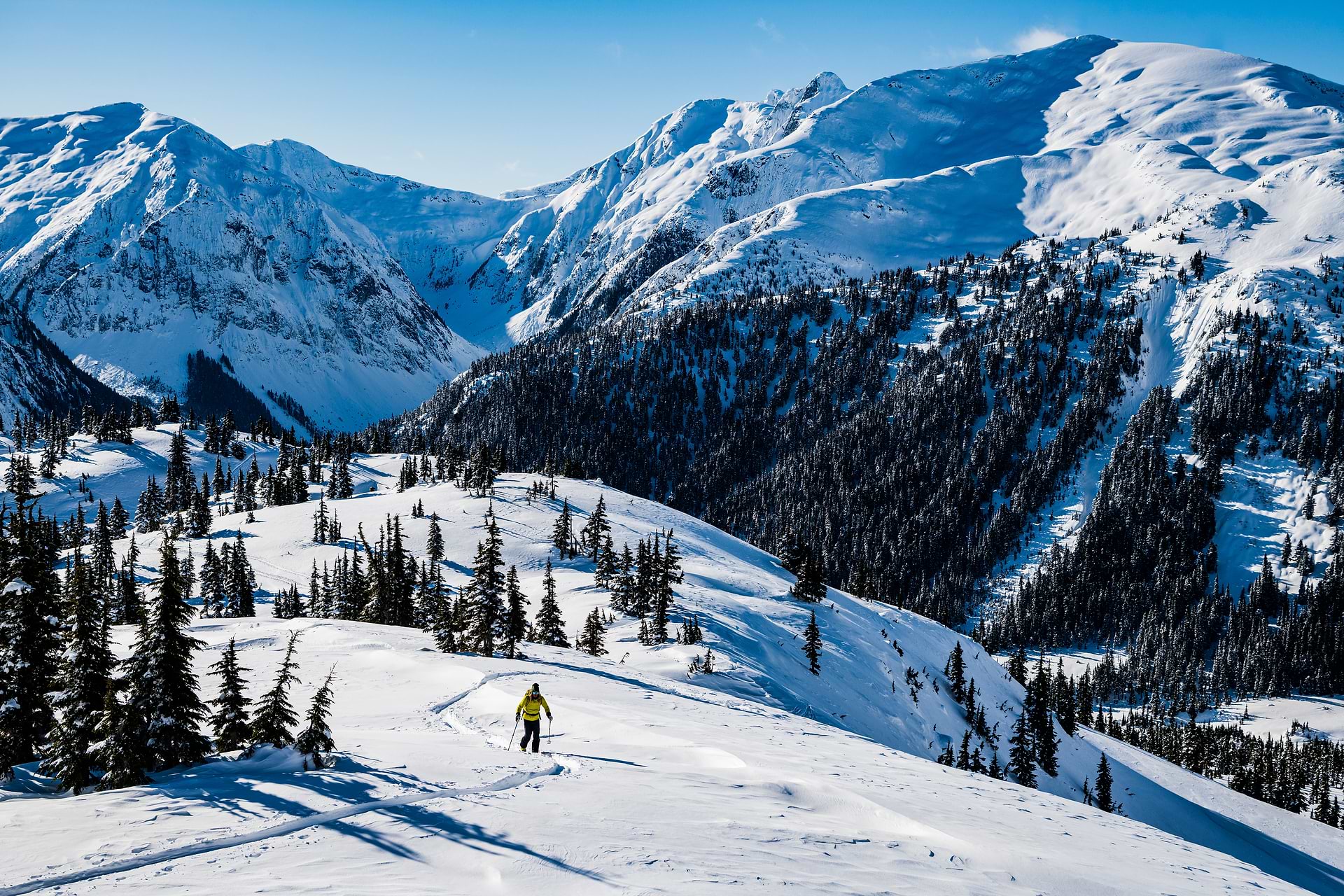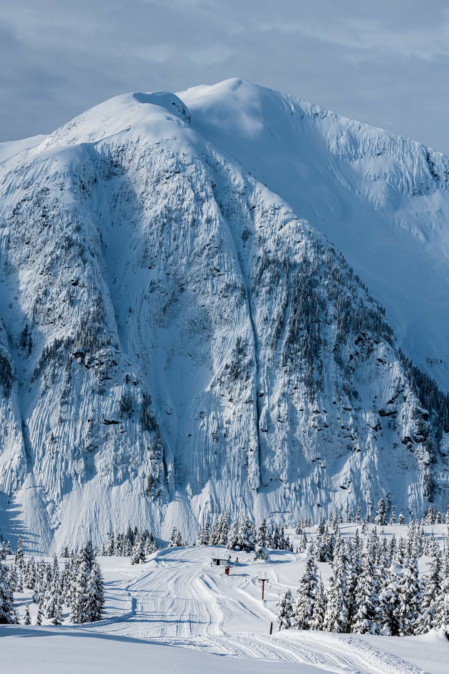 you skate off the T-bar into the kind of fat flakes that ski dreams are made of. Go left, and you’ll drop through out-of-bounds glades, part of what’s been called the best slackcountry in North America. Go right, and it’s thigh-deep plunges down one of Shames’ infamous double blacks — mechanical bulls of stumps and rock that need at least three feet of base to be skiable. On a typical snowy day, however, it feels more like swimming with dolphins as you drop in and out of the depths, gulping air at every turn.
