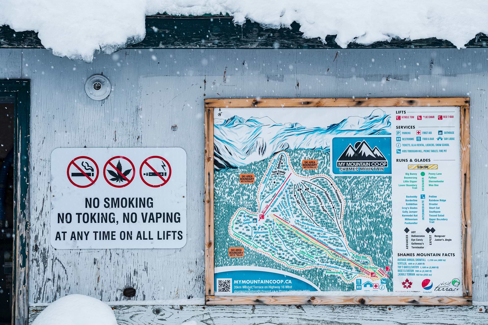 Snow has never been a problem at Shames, but its seclusion and low skier numbers have both been a blessing and a curse from the very beginning. It’s a 15-hour drive from Vancouver, and low skier numbers have both benefited and challenged the hill from the start. Years ago, financial difficulties caught up with it, and rumours circulated that it might shut down permanently. A local group quickly stepped in to purchase the operation and run it as a co-op. Shames still averages only about 350 skiers over four days each week it's open, rarely surpassing 600. Many of these visitors use lifts primarily to access surrounding plateaus and ridges that offer more than 30 separate backcountry routes. Additionally, the ski area has embraced the backcountry experience by offering avalanche courses, developing backcountry route maps, providing an uphill season pass, renting touring gear, and educating skiers through beacon check gates and hazard signage.