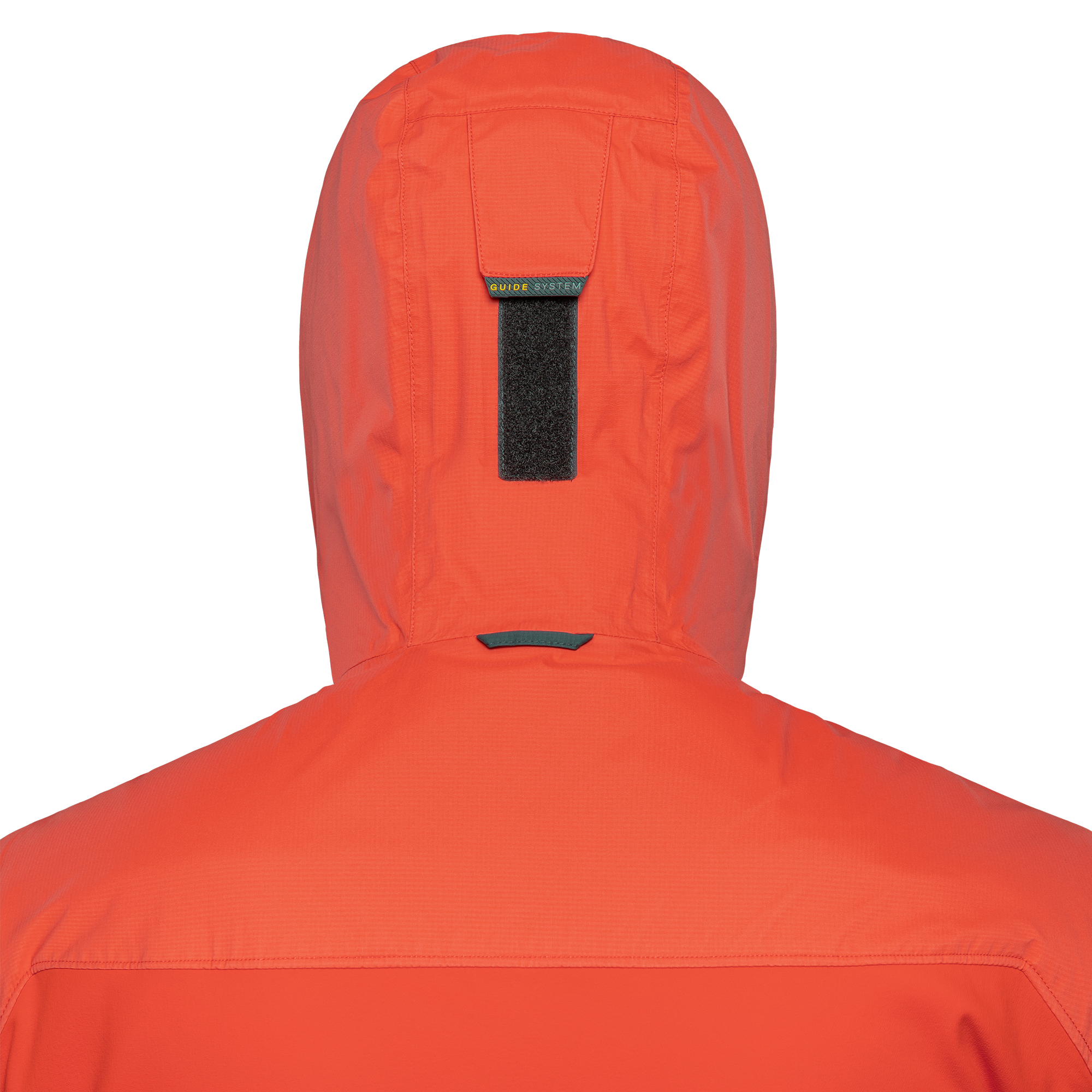 Hood/collar: Fixed hood adjustable at front with cord lock. Adjustable at back with velcro adjustment. Designed to fit over a climbing helmet.