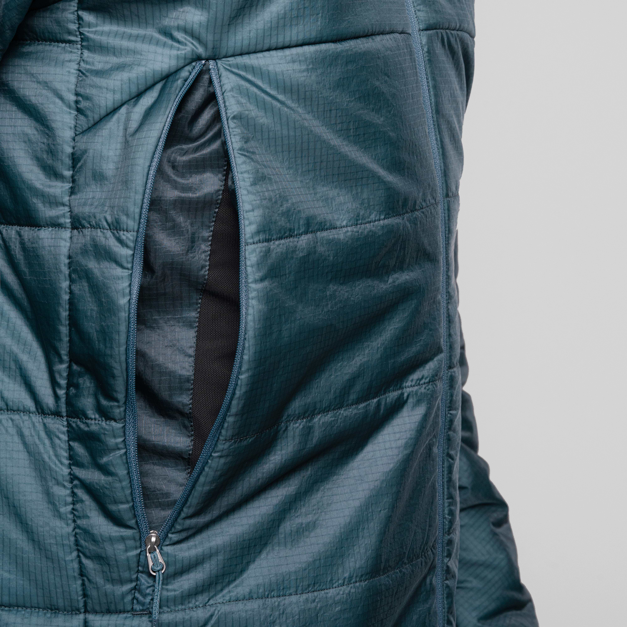 A regular fit and articulated patterning ensure freedom of movement. Two insulated, high-set hand pockets with mesh fabric double as vents — with the right pocket converting into a self-stow pouch. The hood adjusts in two directions.