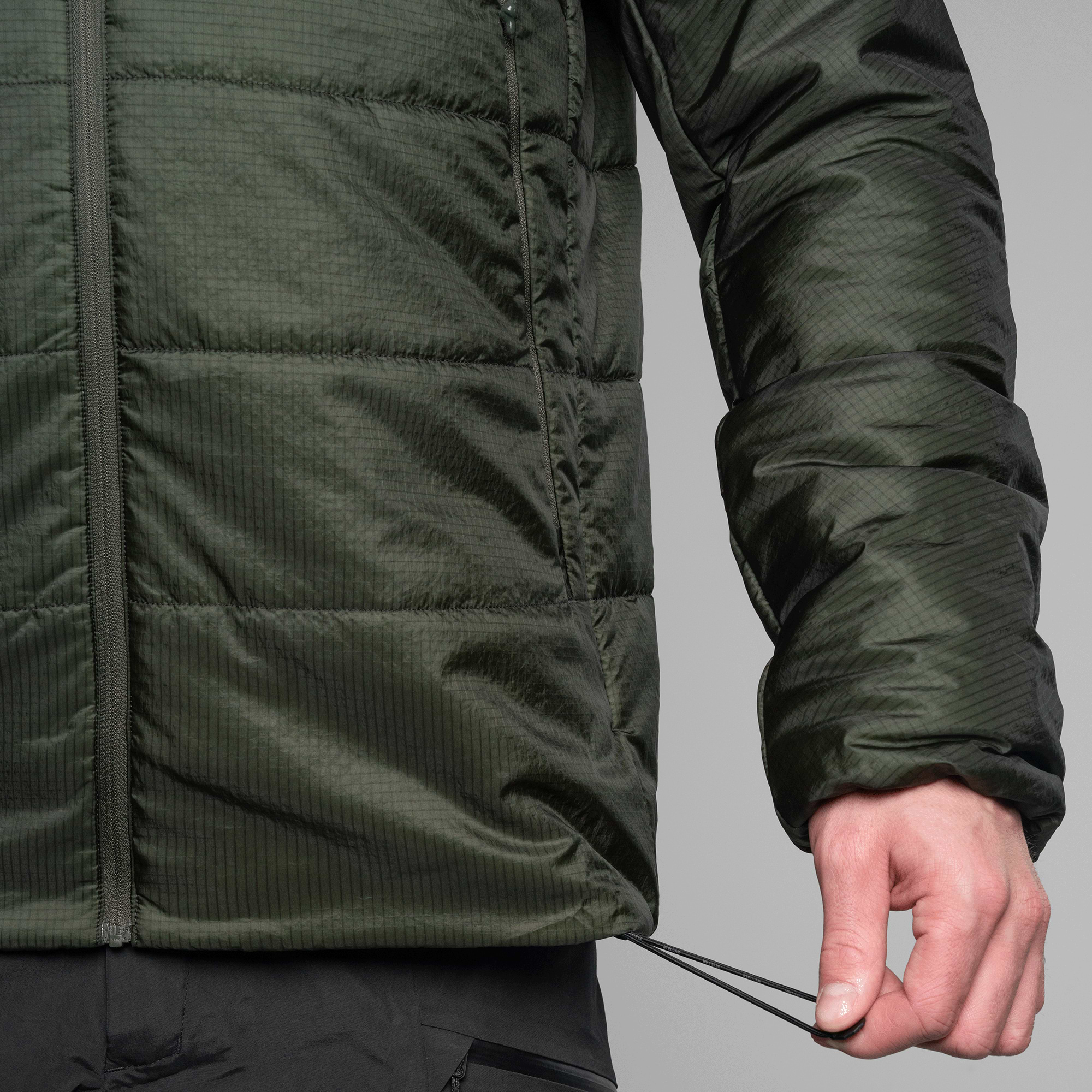 A regular fit and articulated patterning ensure freedom of movement. Two insulated, high-set hand pockets with mesh fabric double as vents — with the right pocket converting into a self-stow pouch. The hood adjusts in two directions.