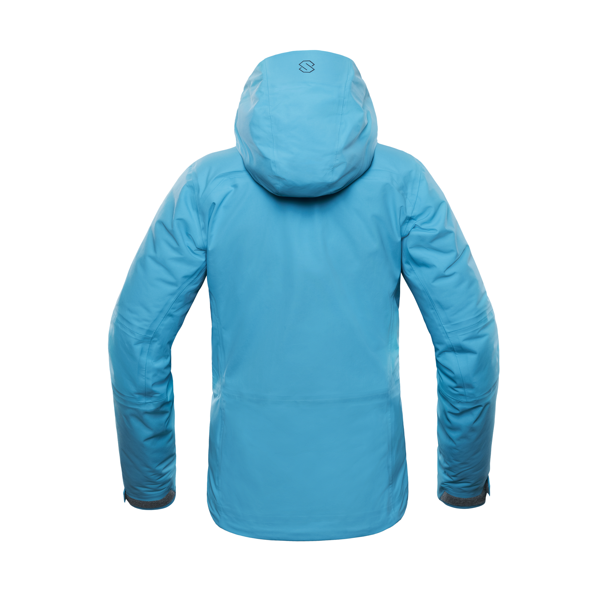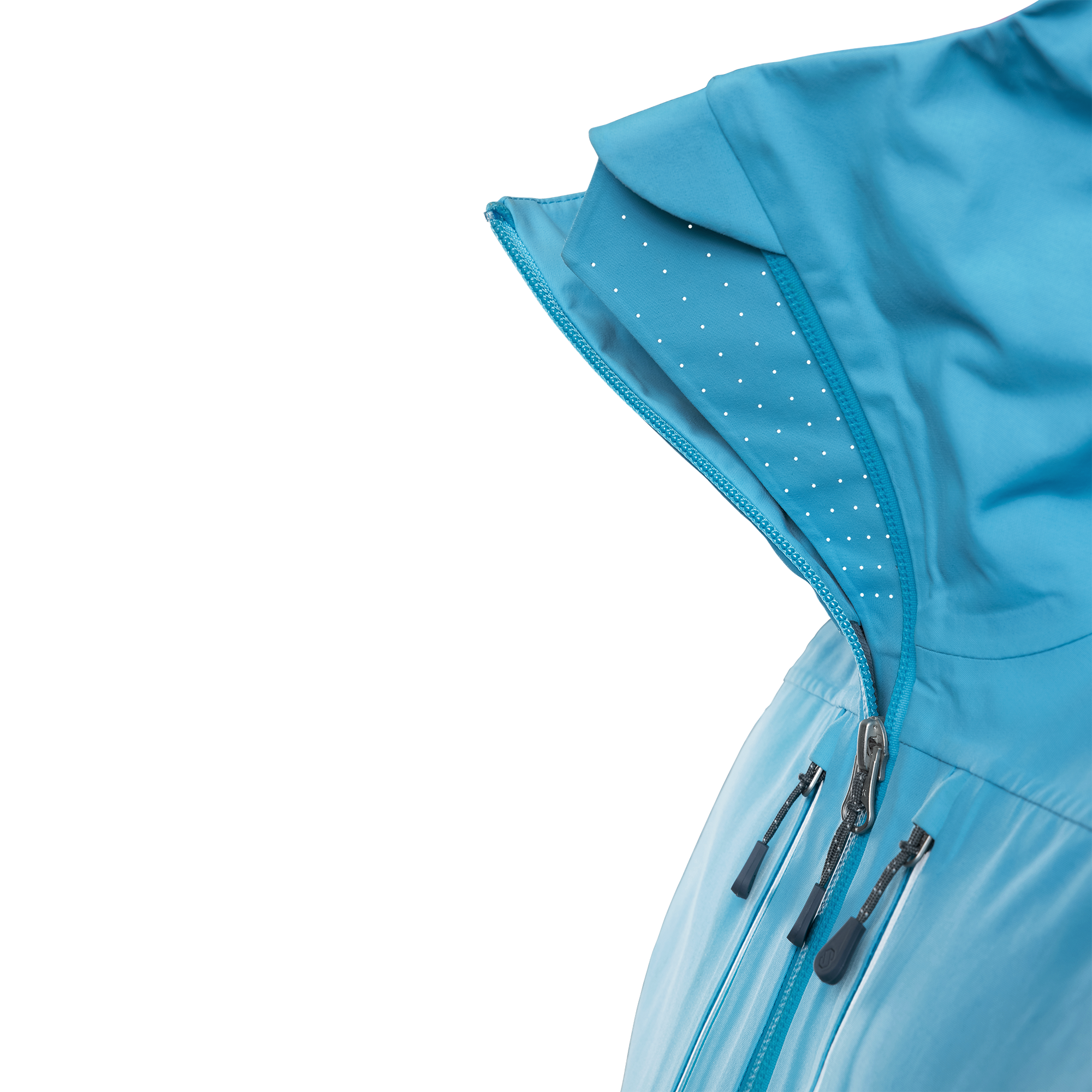 Hood & collar: Fixed hood adjustable at front and at back, helmet compatible. Extra high collar with laser cut ventilation. Inner placket at front equipped with drainage channel.