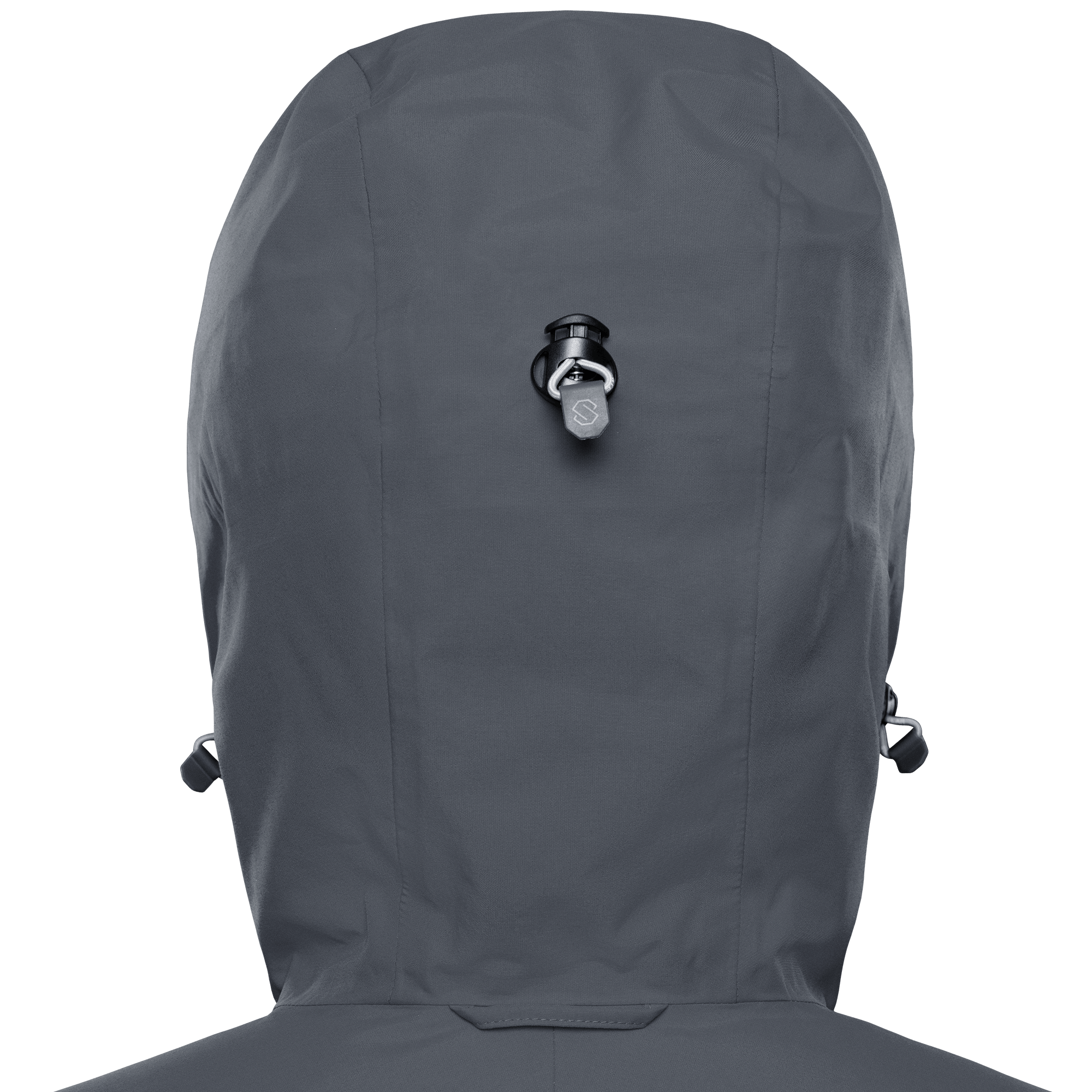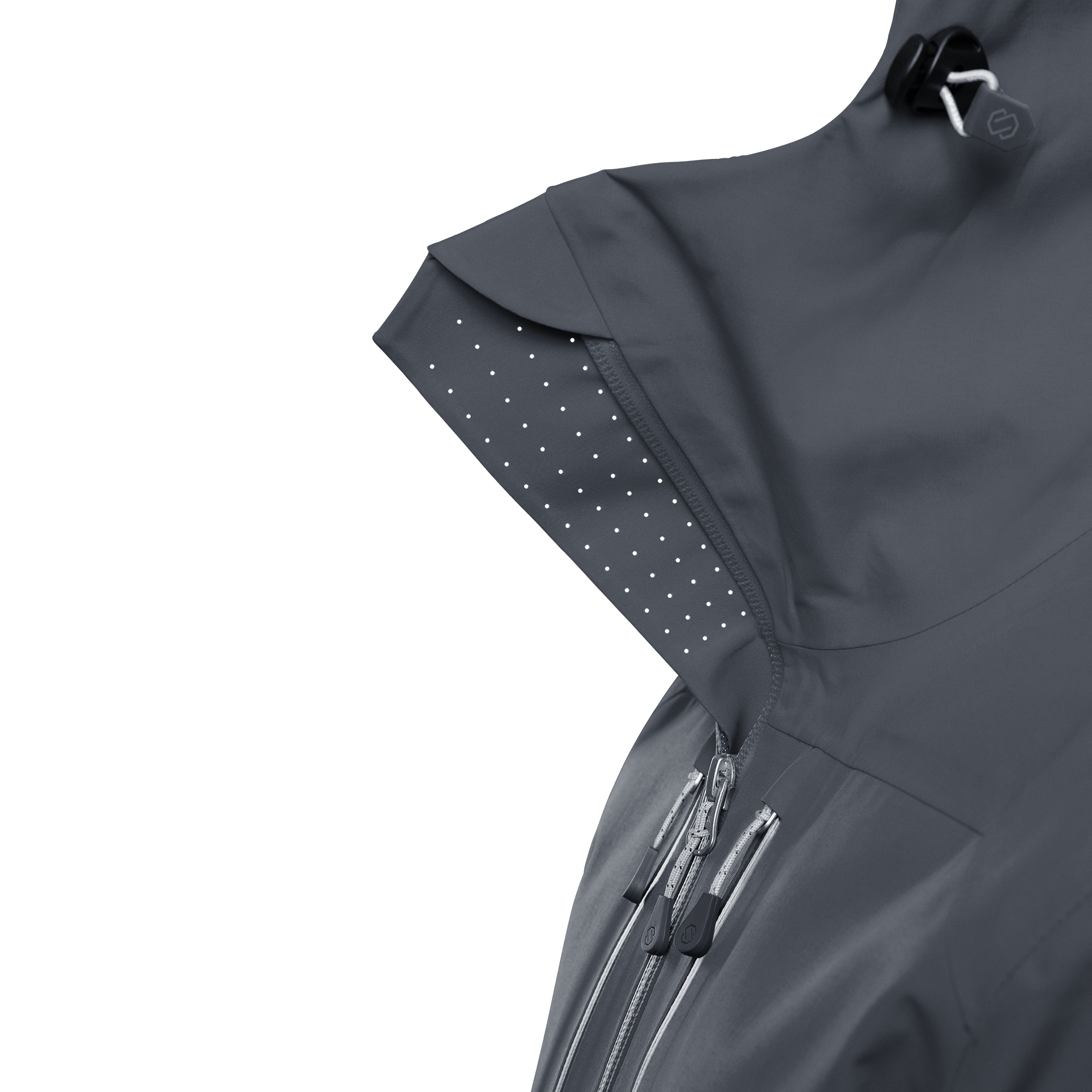 Hood & collar: Fixed hood adjustable at front and at back, helmet compatible. Extra high collar with laser cut ventilation. Inner placket at front equipped with drainage channel.